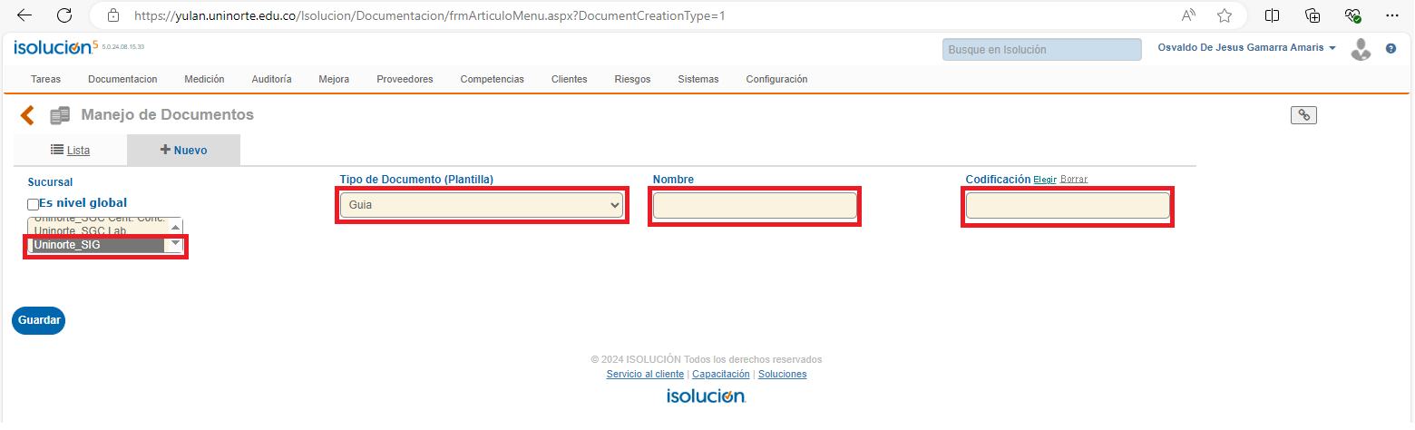 - Ir a la pestaña "Documentación" dentro de la plataforma y elegir la opción "Manejo de documentos". Esta sección permite gestionar la creación, modificación y consulta de documentos.