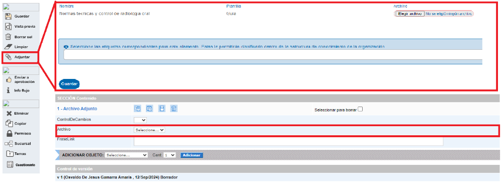- Adjuntar el documento, para ello elija la opción "Adjuntar" del menú a su izquierda, adjunte el archivo y posteriormente seleccione el archivo adjuntado en el campo "Archivo Adjunto"